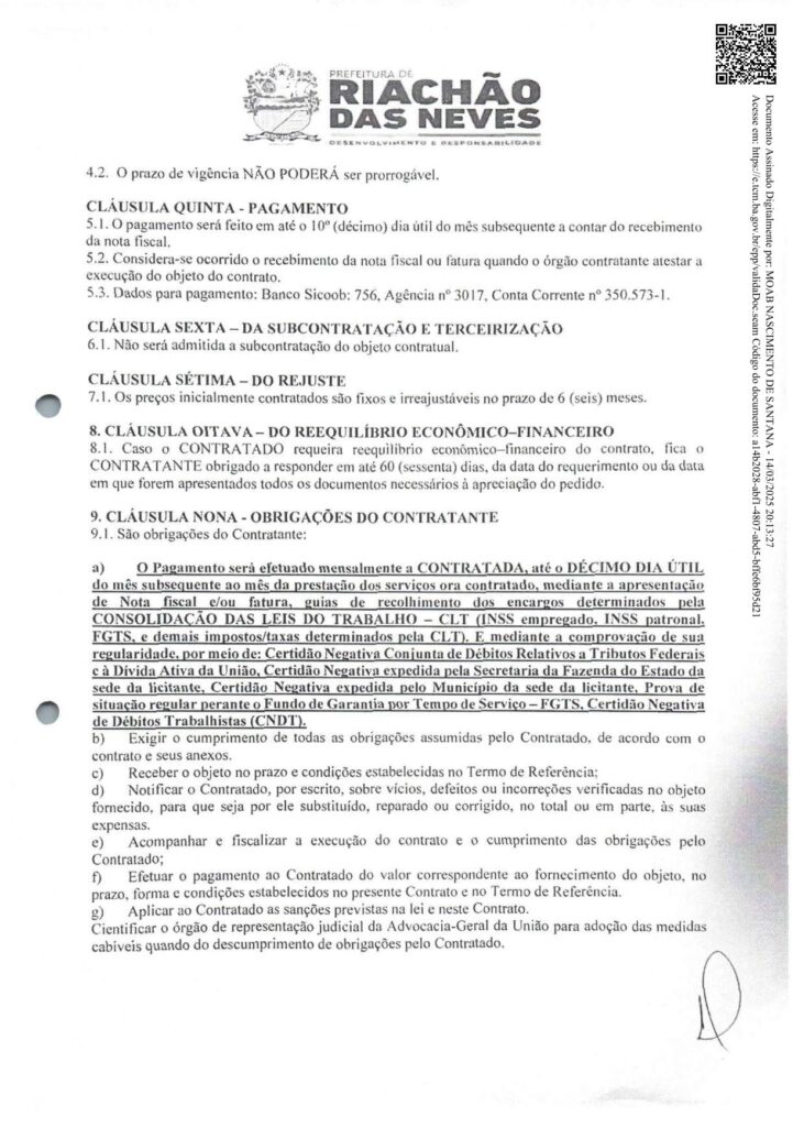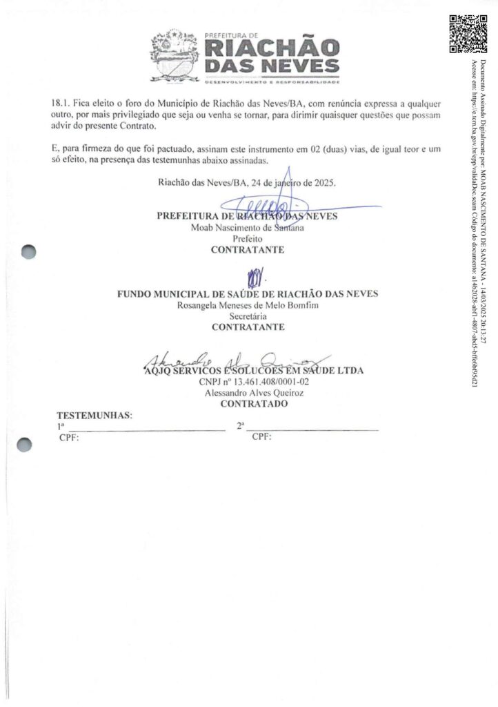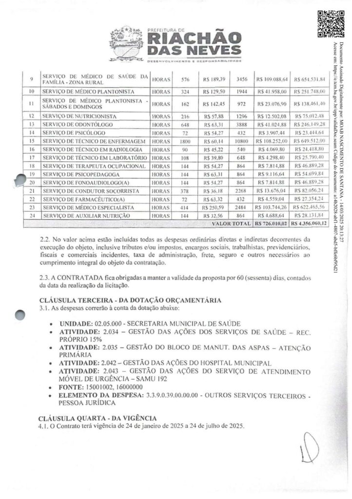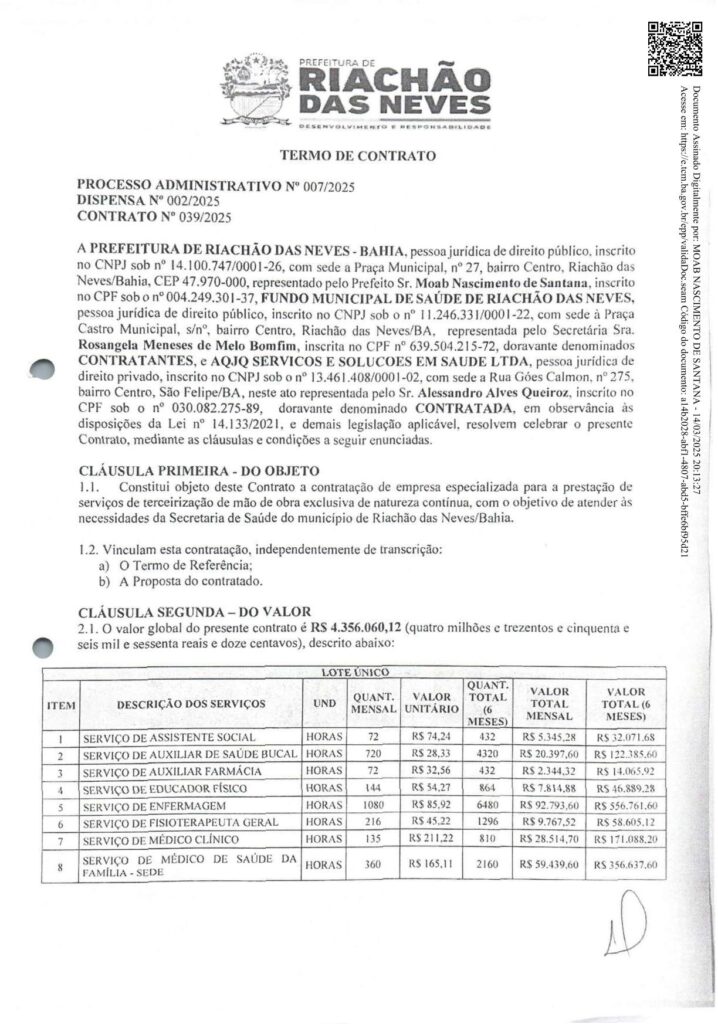 A Prefeitura de Riachão das Neves, localizada no oeste da Bahia, está sendo alvo de críticas e questionamentos após a revelação de um contrato milionário firmado por dispensa de licitação, no valor de R$ 5.445.075,15, para fornecimento de mão de obra na área da saúde pública.